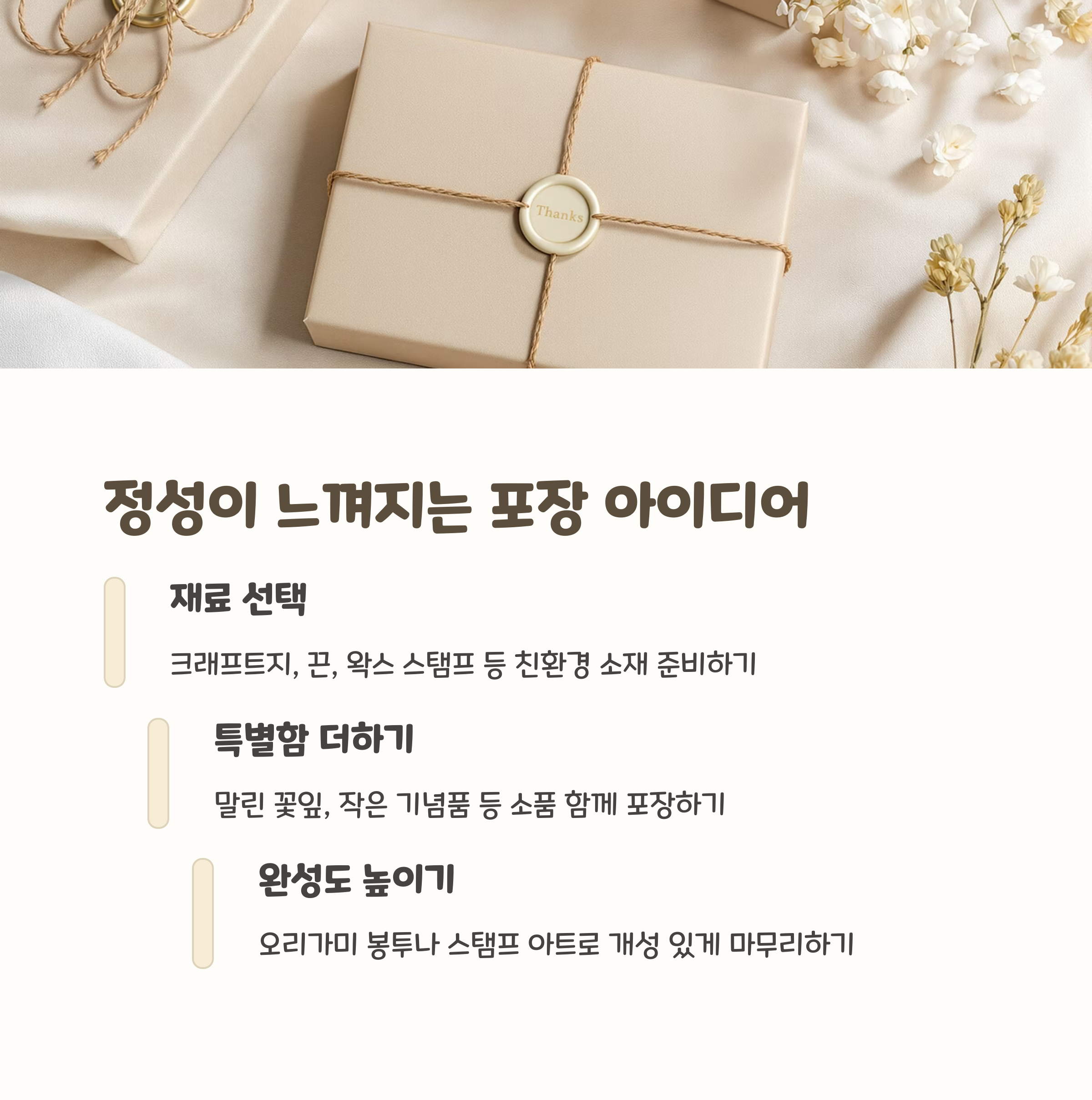 카드만 건네는 것도 좋지만, 작은 봉투나 끈으로 포장하면 정성이 더 느껴져요. 자연 소재 끈이나 손글씨 라벨을 붙이면 감성이 한껏 살아난답니다. 작은 꽃 한 송이를 곁들여도 정말 예쁘겠죠?