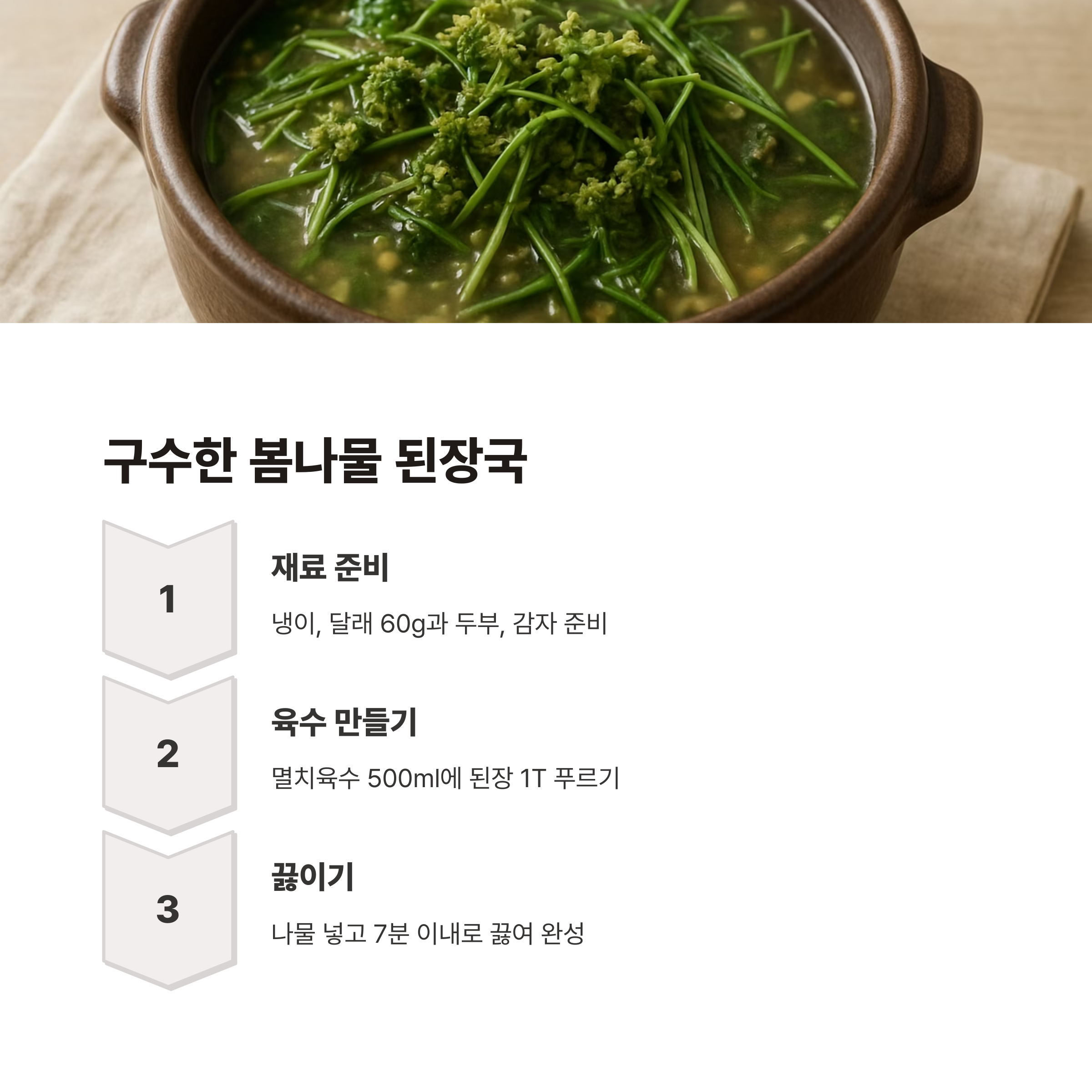 냉이나 쑥갓을 넣어 구수한 된장국 끓여볼까요? 육수에 된장을 풀고, 나물과 두부를 넣으면 영양 만점 봄국이 완성돼요. 든든하고 따뜻한 봄 한 끼로 최고예요!