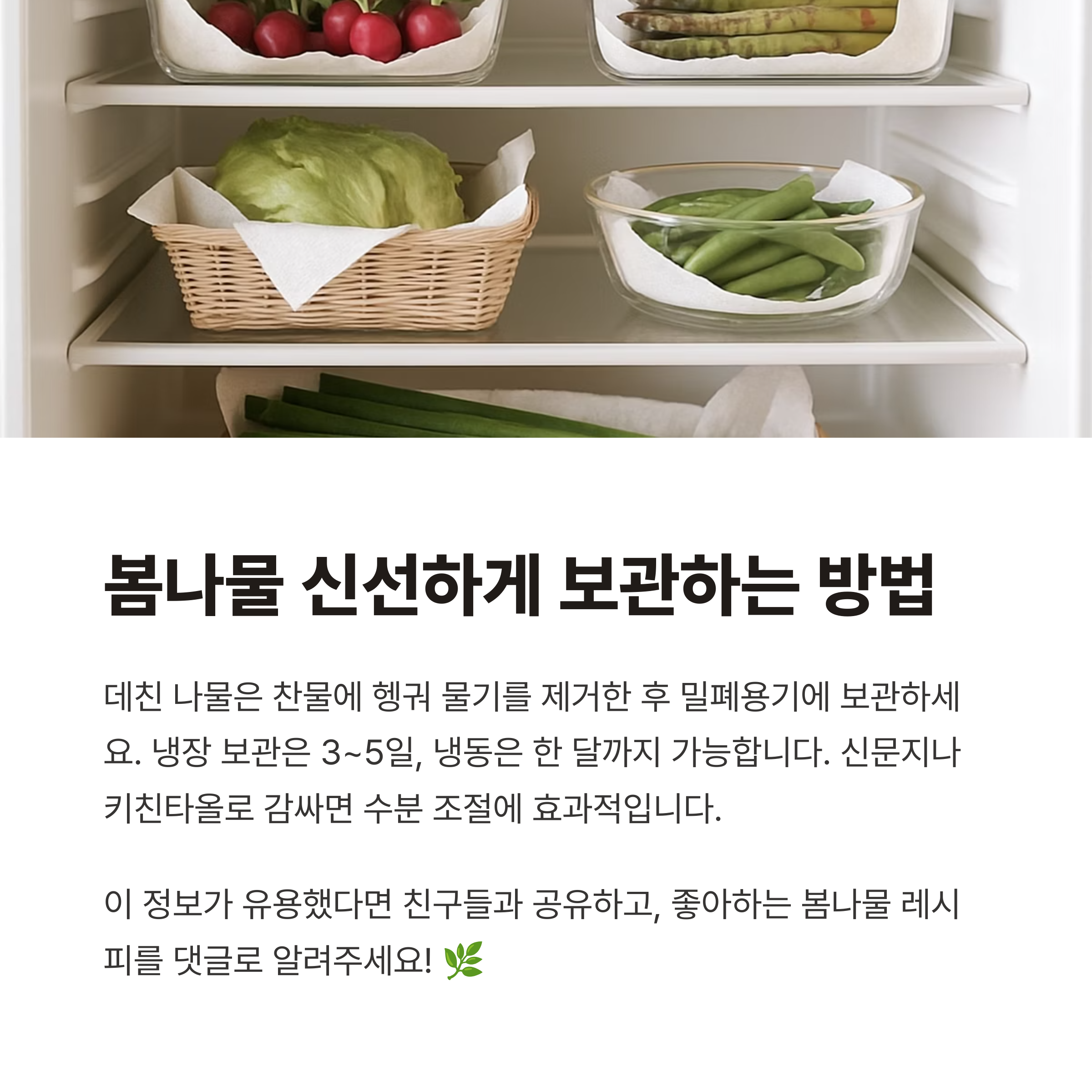 봄나물로 봄을 한입 가득 느낄 준비 되셨나요? 간단한 레시피로도 충분히 건강하고 맛있는 한 끼를 즐길 수 있답니다. 여러분만의 봄나물 레시피나 꿀팁이 있다면 댓글로 함께 나눠주세요! 🌸 행복한 봄날 보내세요!