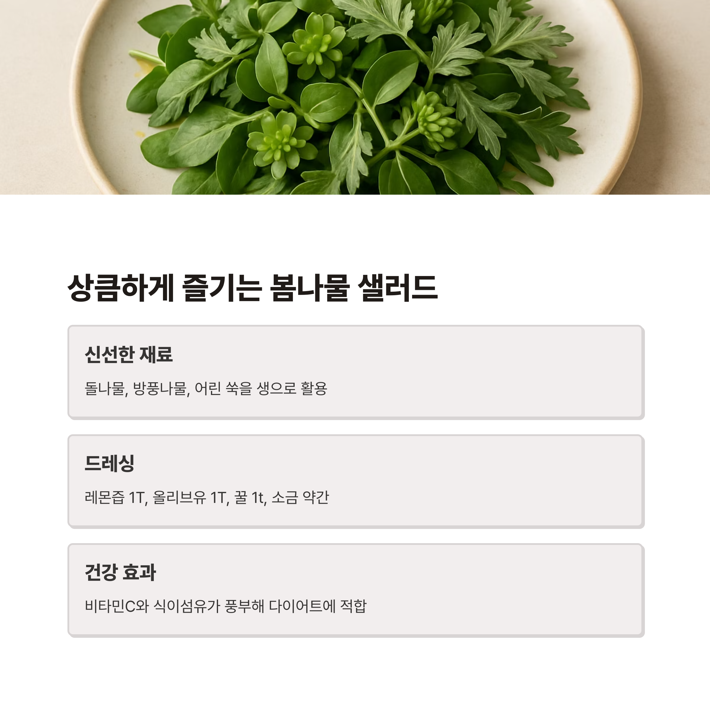 싱싱한 봄나물을 씻어 물기 제거 후, 발사믹 드레싱이나 유자 드레싱과 버무려 보세요. 상큼하고 가벼운 봄나물 샐러드는 입맛 없을 때도 쏙쏙 들어간답니다!