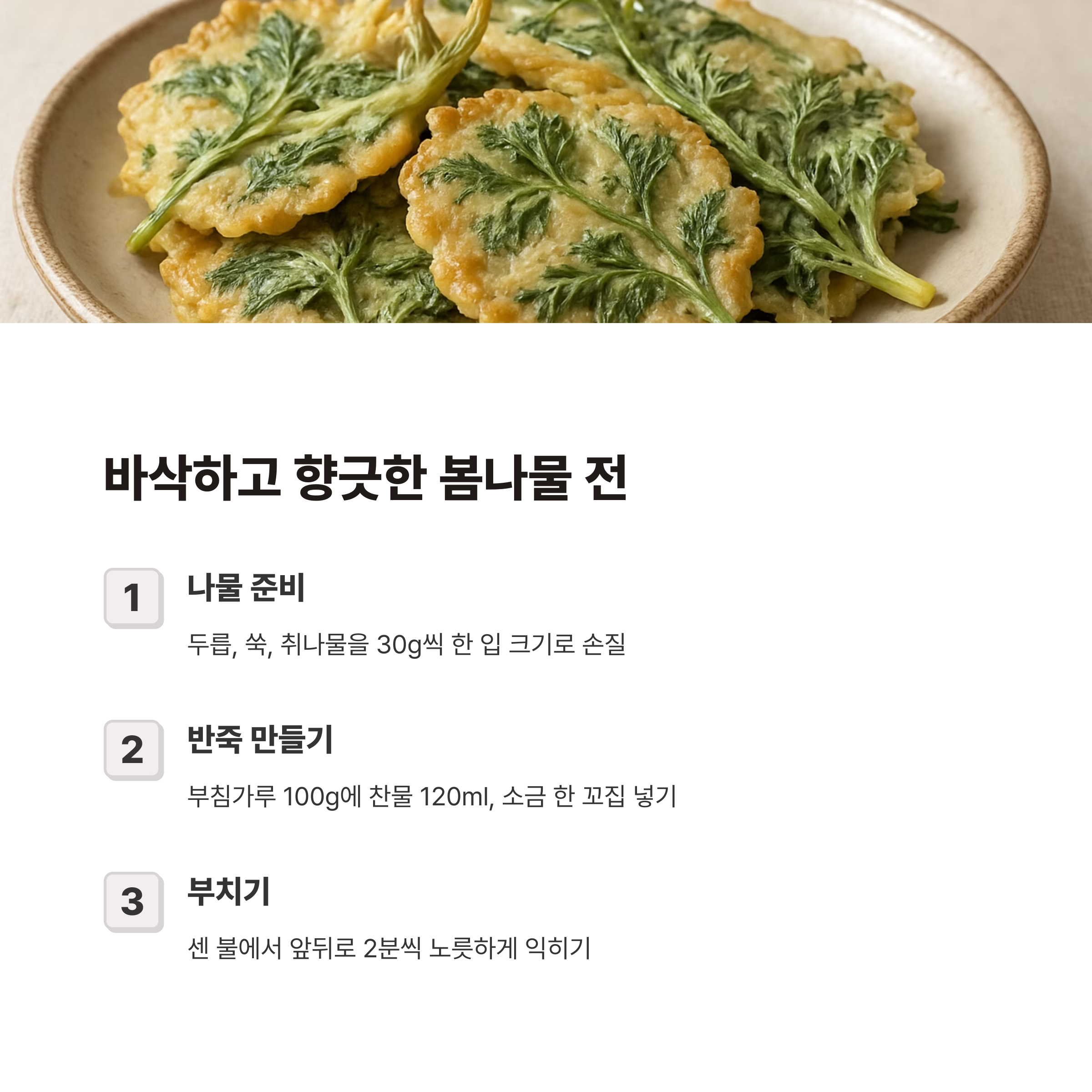 냉장고 속 봄나물을 몽땅 넣고 부침가루 반죽과 함께 부쳐보세요. 노릇노릇 구워낸 봄나물 전은 식탁 위 별미! 취나물, 달래, 냉이 다 잘 어울려요.