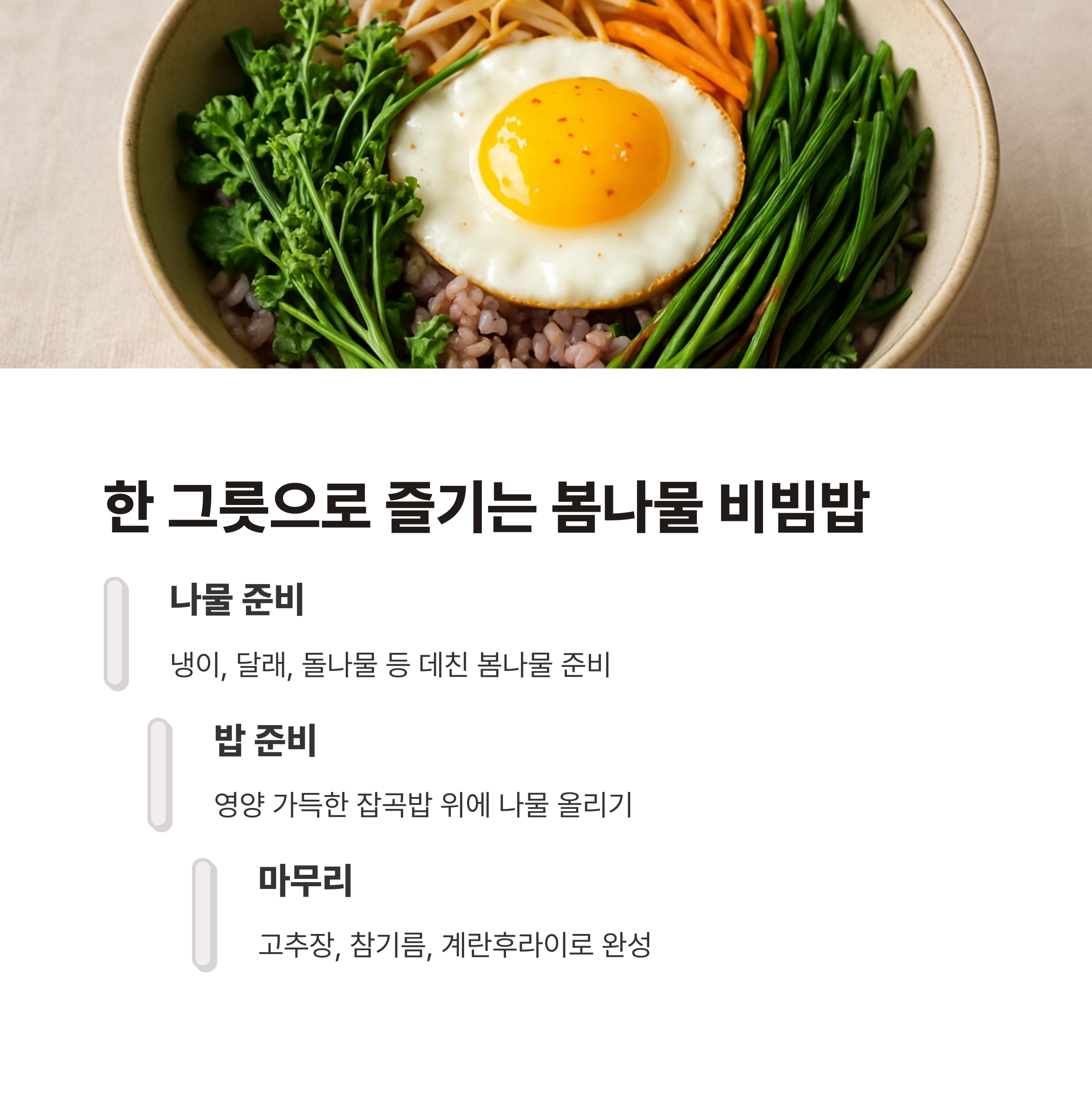 여러 가지 봄나물을 조금씩 준비해서, 밥 위에 얹고 고추장 양념만 살짝 곁들이면 끝! 간단하면서도 봄 향기가 가득 퍼지는 한 그릇이 완성돼요. 참기름 한 방울 잊지 마세요. 비빔밥의 풍미를 확 살려준답니다!