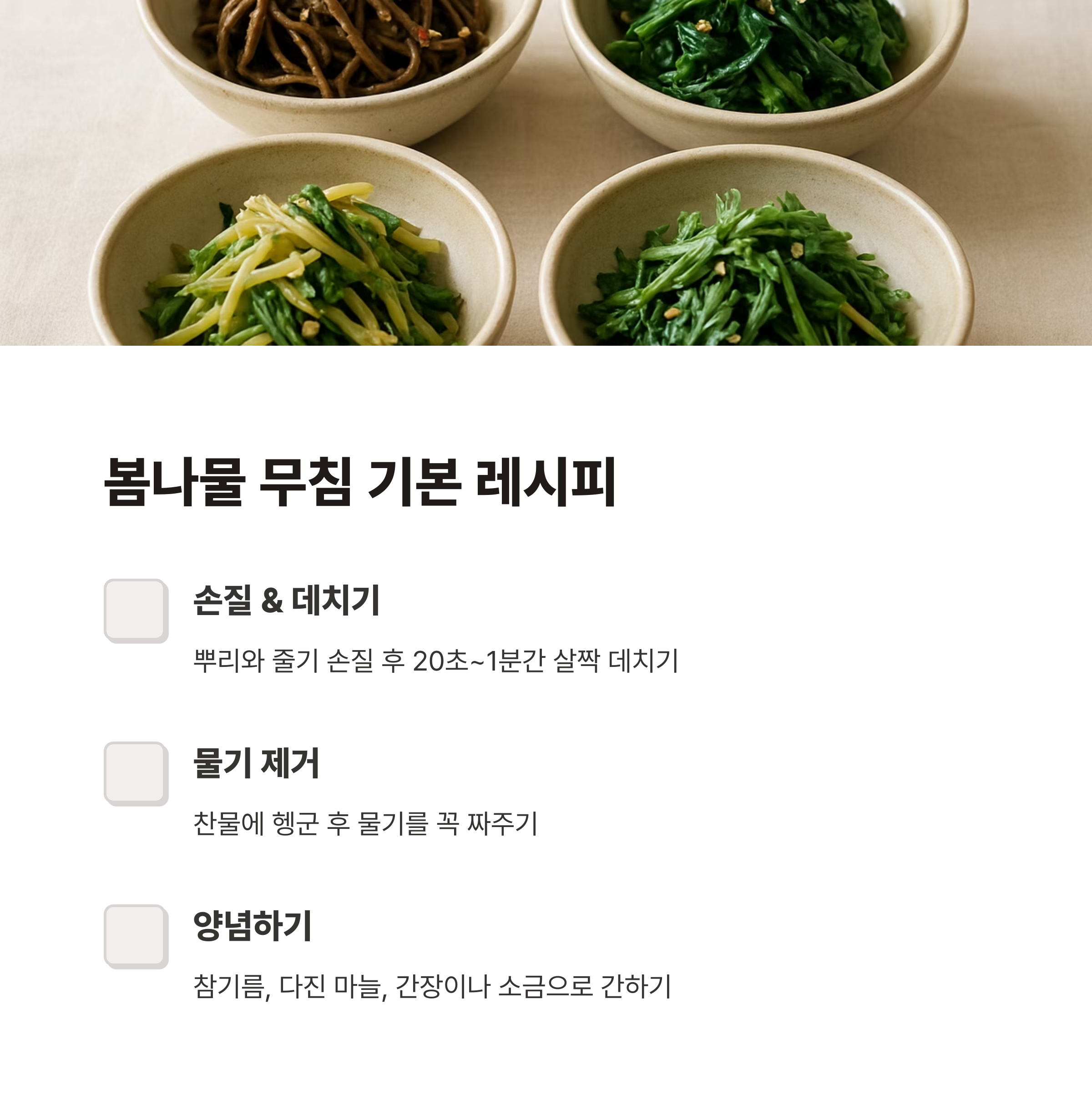 안녕하세요 여러분! 따스한 햇살과 함께 봄나물이 싱그럽게 올라오는 계절이 왔어요. 🌼 나물 하면 왠지 손이 많이 가고 어렵게 느껴질 수도 있지만, 사실 알고 보면 간단하고 건강한 요리를 완성할 수 있답니다! 오늘은 초간단 반찬부터 근사한 메인요리까지, 봄나물을 활용한 맛있는 레시피를 소개해 드릴게요. 함께 상큼한 봄 식탁을 차려볼까요?