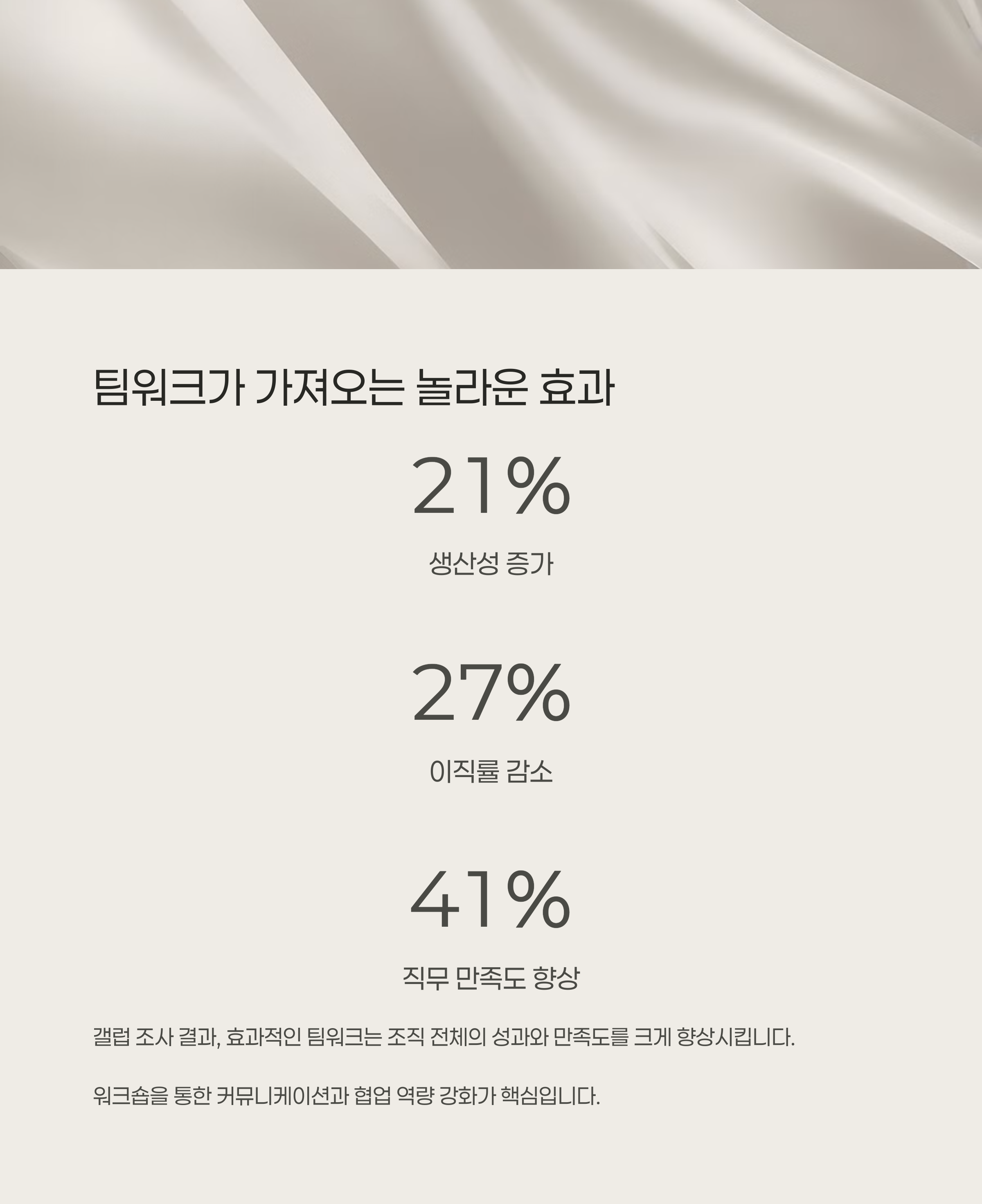 그래서 오늘은 진짜 팀 분위기가 좋아지는, 효과 100% 팀워크 워크숍 추천 코스를 준비했어요!