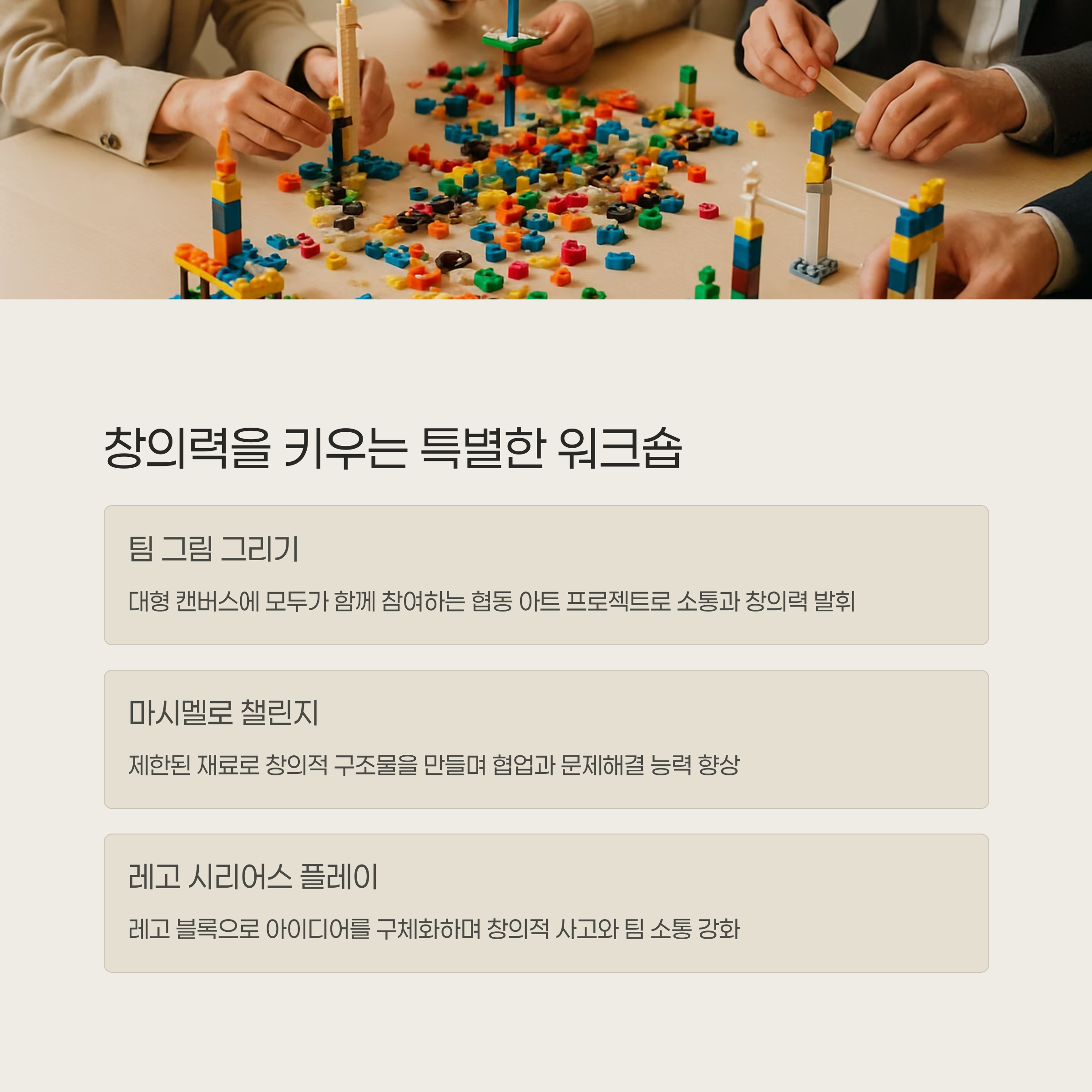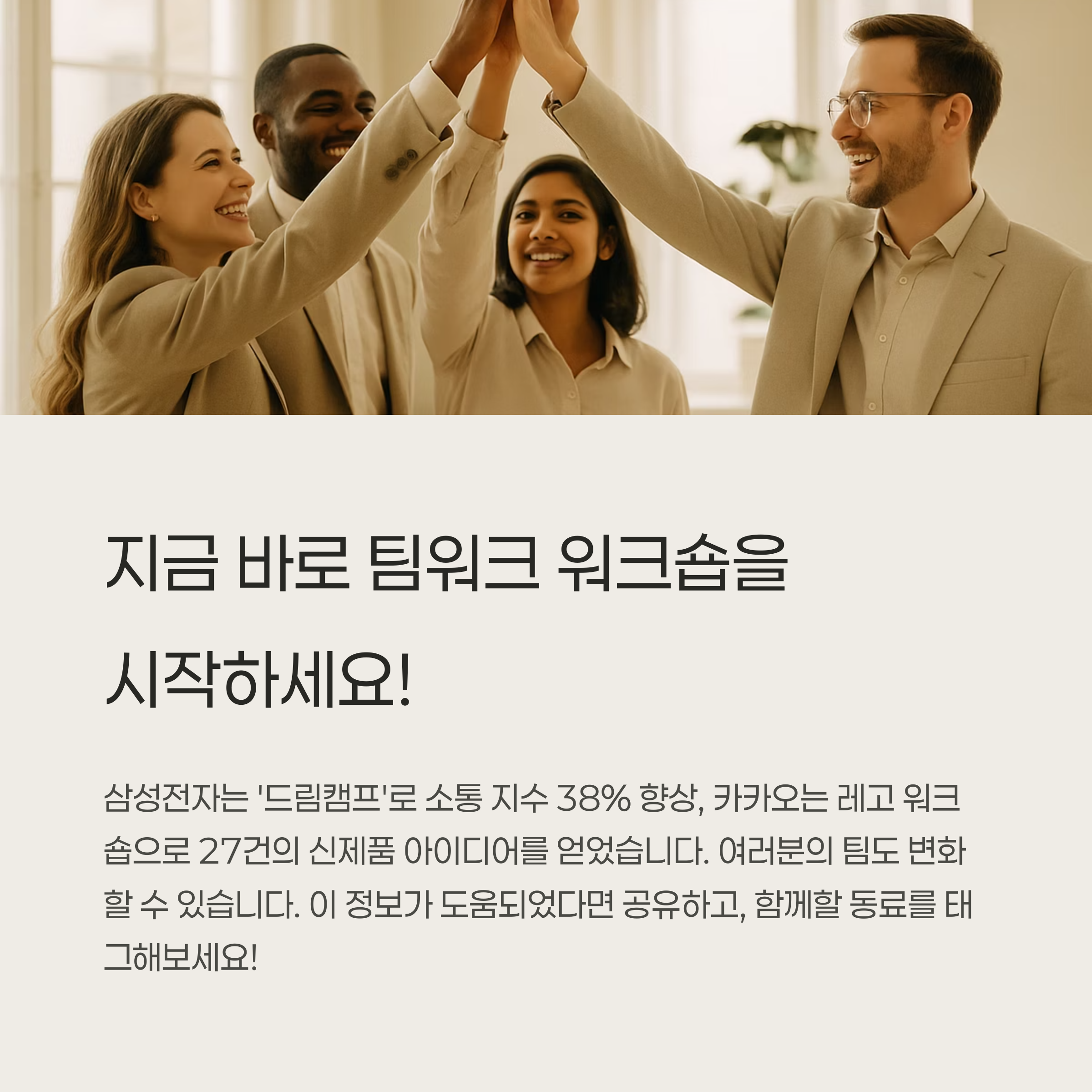 "여러분, 혹시 팀원들과 더 끈끈한 신뢰를 쌓고 싶은 순간, 고민되신 적 있나요?" 오늘은 그런 여러분을 위한 팀워크 워크숍 추천 리스트를 소개할게요!