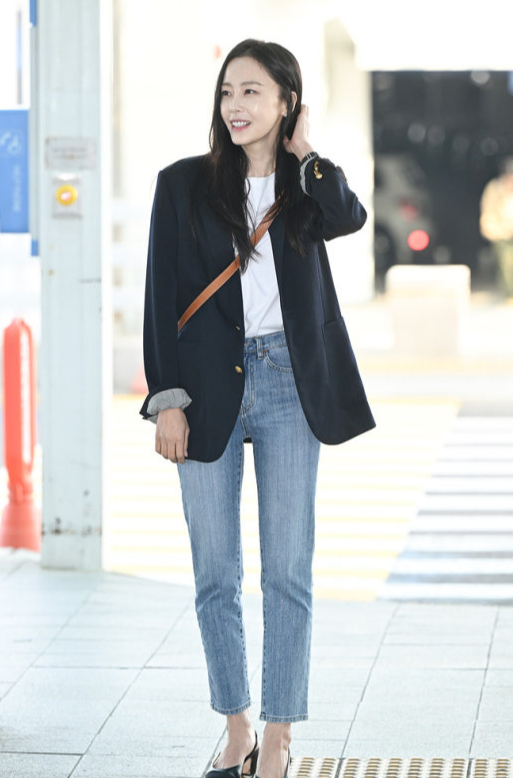 차분하면서도 우아한 무드의 공항 패션은 단정한 슬랙스와 미니멀한 블라우스로 꾸며져 있었고요.