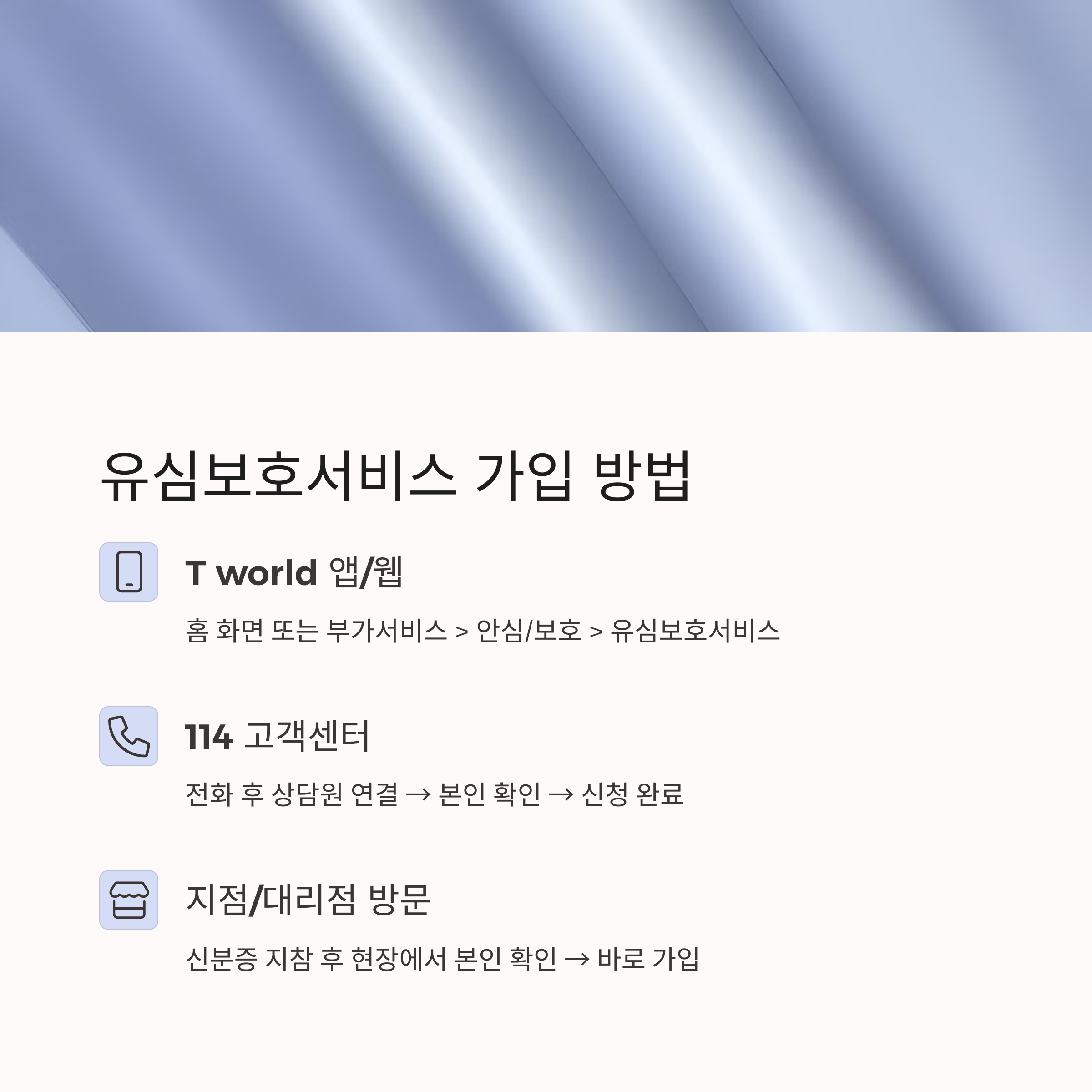 | T world 앱/웹 | 홈 화면 또는 부가서비스 > 안심/보호 > 유심보호서비스에서 신청 |